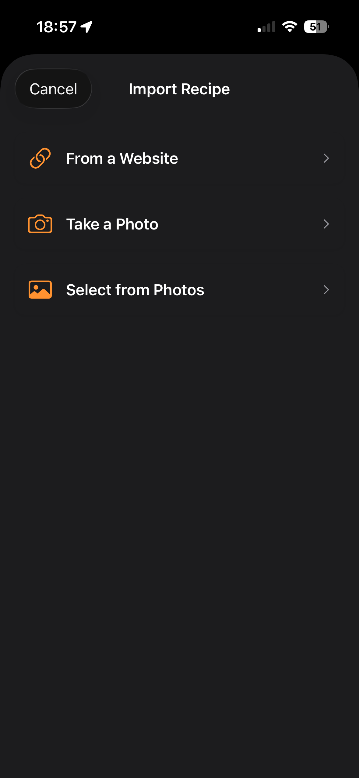 Open the Discover tab and tap the orange "Add Recipe" button. Select "Take a Photo" from the import options.