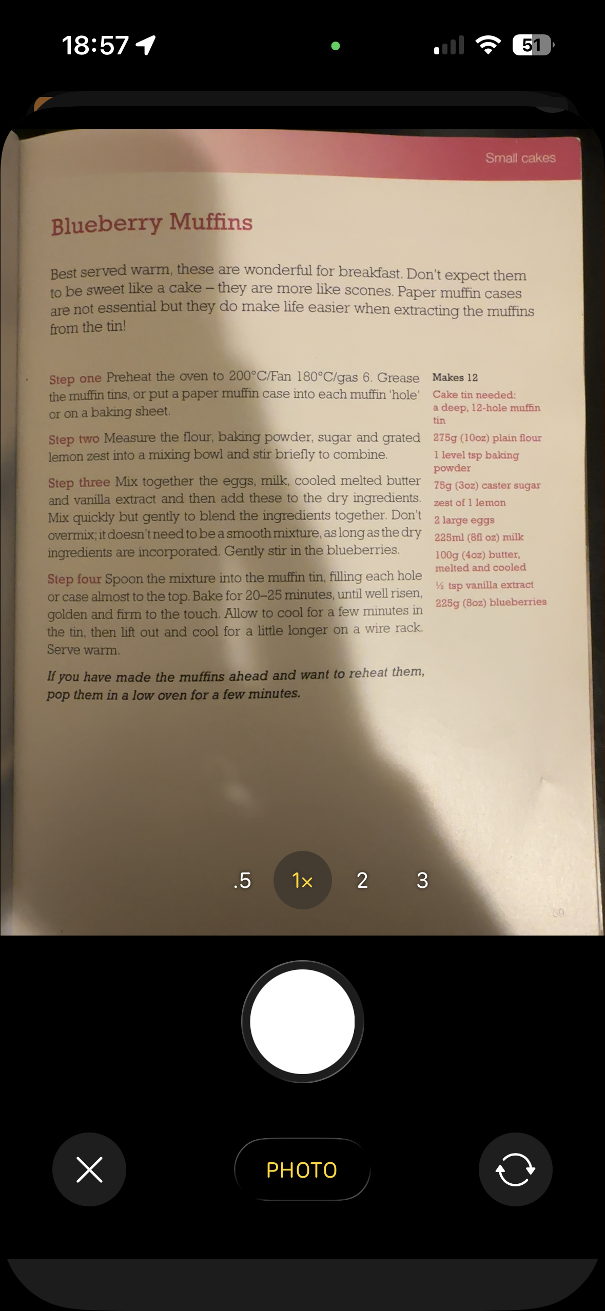 Point your camera at the recipe page. The app handles up to 5 photos for longer recipes, though most fit on a single page. Frame the recipe clearly and tap the capture button.