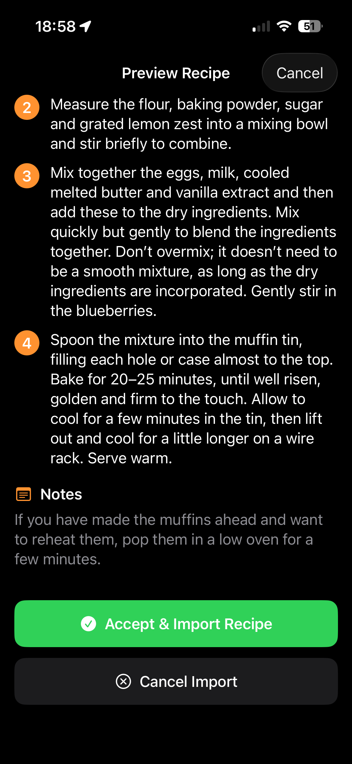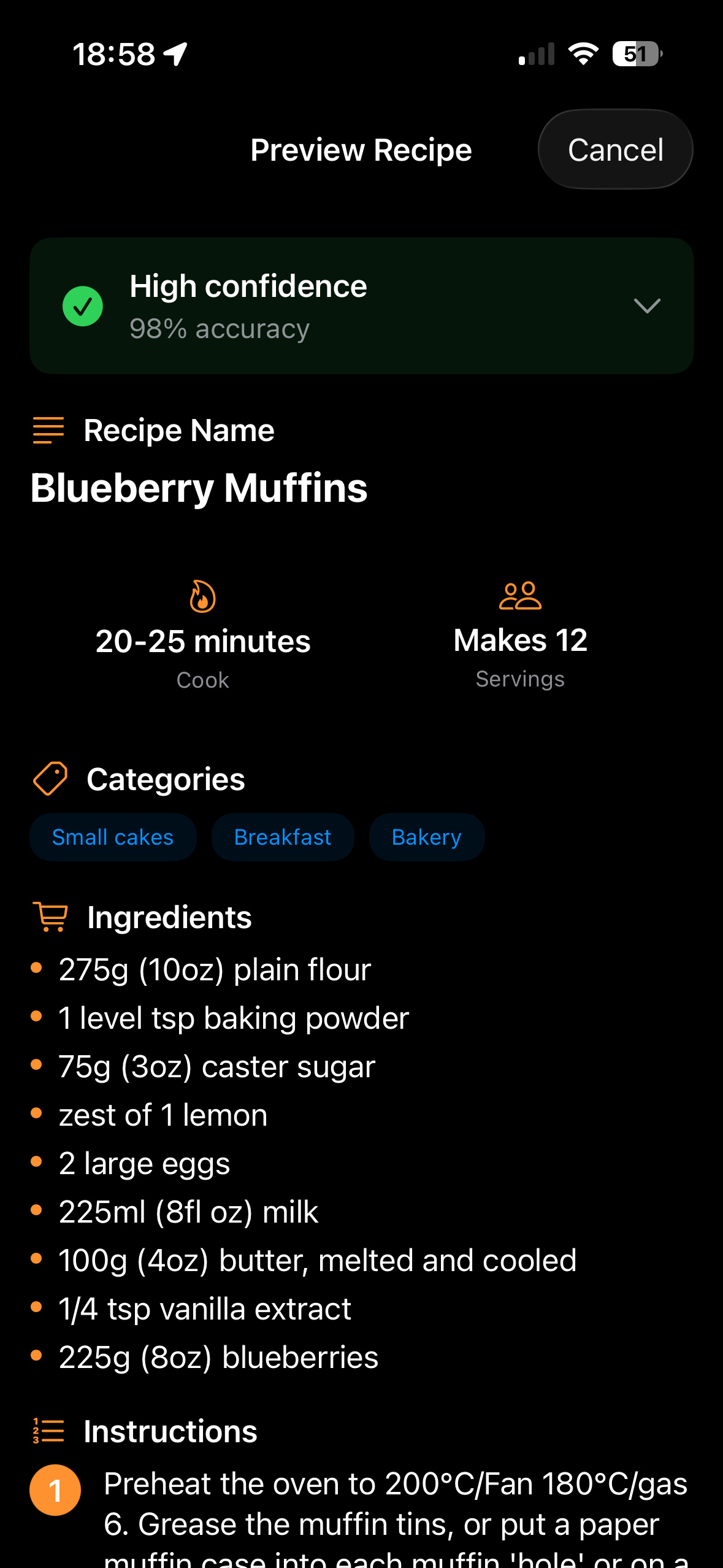 The app shows you the extracted recipe with a confidence rating. Review the recipe name, ingredients, instructions, and timing. If everything looks correct, tap "Accept & Import Recipe.