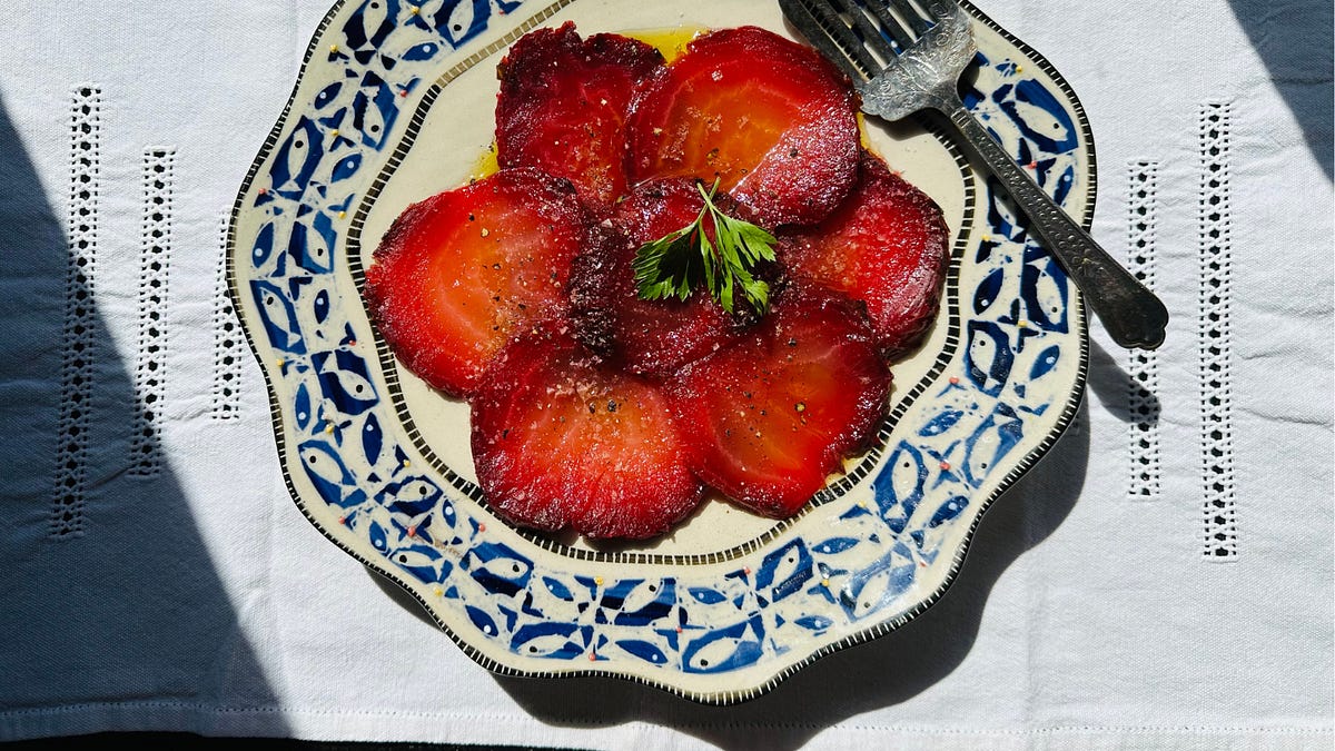 This post is pure Cooking with Marcella. Lisa bakes a beetroot from her local tropical market alongside a yam, simply because the oven was already hot. She then returns to Marcella's instructions, recalls her advice about choosing beets by their tops, and shares the memory of tiny Venetian beets Marcella loved at the Rialto market. The recipe itself is almost nothing: salt, olive oil, red wine vinegar. But the writing around it makes you understand why that's enough.