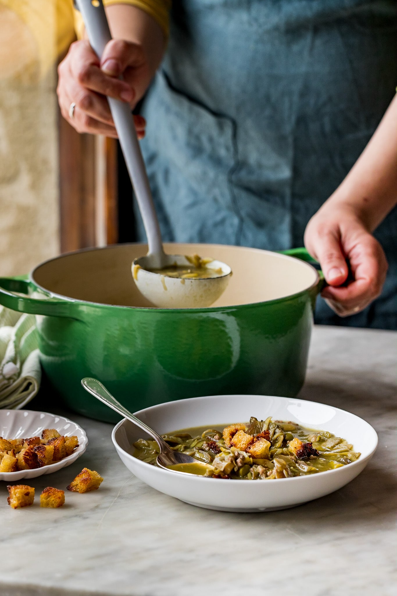 The soup celebrates spring's first vegetables: fresh fava beans, peas, asparagus, and artichokes, simmered with spring onions, pancetta, and ground beef in a light broth. "It is a soup that depicts spring with its soft colours," Giulia writes. "Cook the garmugia often and in large quantities when these ingredients are in season, as then you will have to wait another year to be able to taste it again."